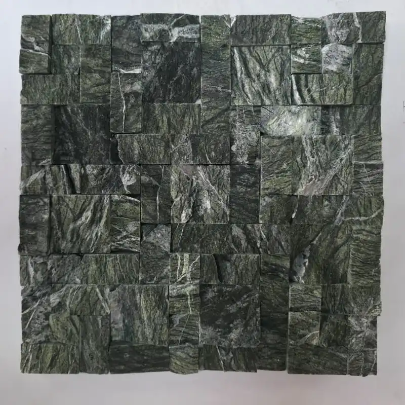 Transform any space with the striking, natural beauty of our Rainforest Green Marble Mosaic Tile. Sourced from authentic natural stone, this cladding offers a dramatic blend of deep green hues and contrasting white, grey, and brown veining, ensuring a one-of-a-kind feature wall or splash back.